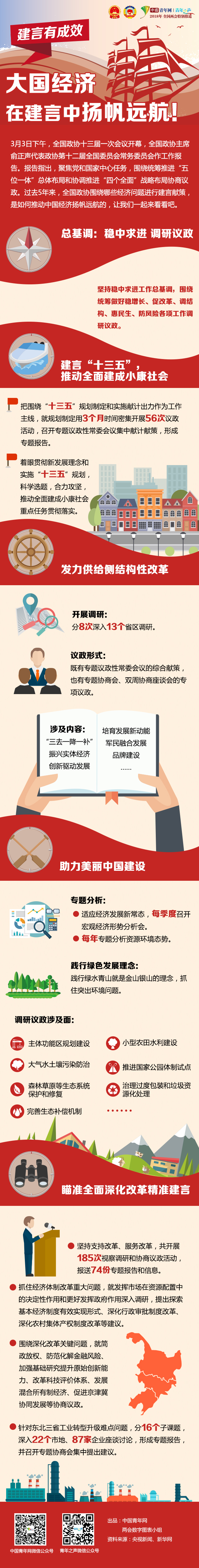 中國青年網(wǎng)北京3月4日電 3月3日下午,全國政協(xié)十三屆一次會議開幕,全國政協(xié)主席俞正聲代表政協(xié)第十二屆全國委員會常務(wù)委員會作工作報(bào)告。報(bào)告指出,聚焦黨和國家中心任務(wù),圍繞統(tǒng)籌推進(jìn)“五位一體”總體布局和協(xié)調(diào)推進(jìn)“四個(gè)全面”戰(zhàn)略布局協(xié)商議政。過去5年來,全國政協(xié)圍繞哪些經(jīng)濟(jì)問題進(jìn)行建言獻(xiàn)策,是如何推動(dòng)中國經(jīng)濟(jì)揚(yáng)帆遠(yuǎn)航的,讓我們一起來看看吧。