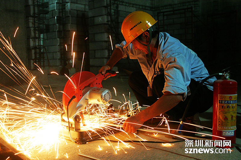 在地鐵6號線大浪站,一名地鐵工人正在進行材料切割,火花飛濺,旁邊是干粉滅火器