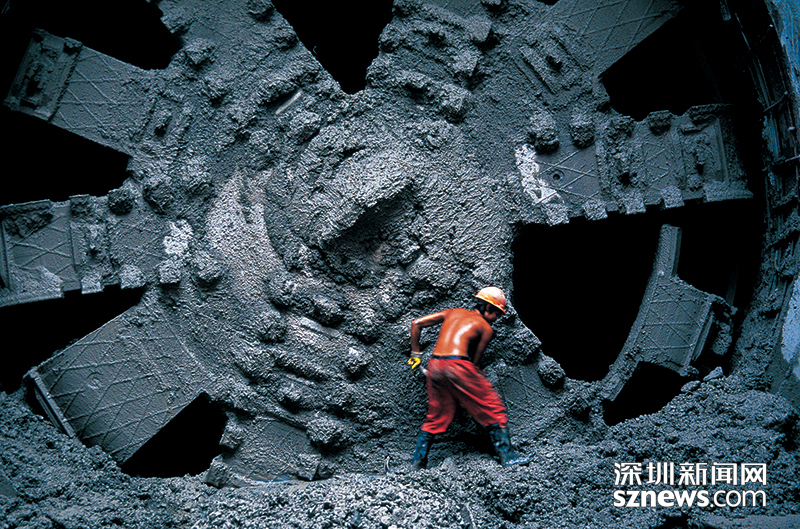 深圳地鐵的建設(shè)離不開無數(shù)人的汗水,圖中建設(shè)工人正在清理盾構(gòu)機前的淤泥