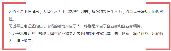中國特色社會主義進入新時代,建設現(xiàn)代化經(jīng)濟體系,推動經(jīng)濟發(fā)展質(zhì)量變革、效率變革、動力變革,需要更好發(fā)揮包括國有企業(yè)家在內(nèi)的廣大企業(yè)家的作用。去年黨中央專門印發(fā)了《關于營造企業(yè)家健康成長環(huán)境,弘揚企業(yè)家精神、更好發(fā)揮企業(yè)家作用的意見》,極大地調(diào)動了企業(yè)家干事創(chuàng)業(yè)的積極性。落實好中央精神,關心愛護企業(yè)家,需要各方面共同努力。