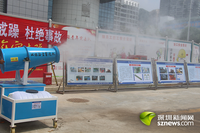 施工單位還在圍擋四周、豎井入口、基坑周邊、隧道掌子面等施工區(qū)域設(shè)置全方位的水幕降塵系統(tǒng),可有效控制和治理地面及空中揚塵,改善工地周邊空氣質(zhì)量。此外,該工地采用高強噴霧機,利用不同形狀和霧化角度的噴嘴將水霧化,與粉塵凝聚沉積下來,達到消除粉塵、凈化空氣的效果。