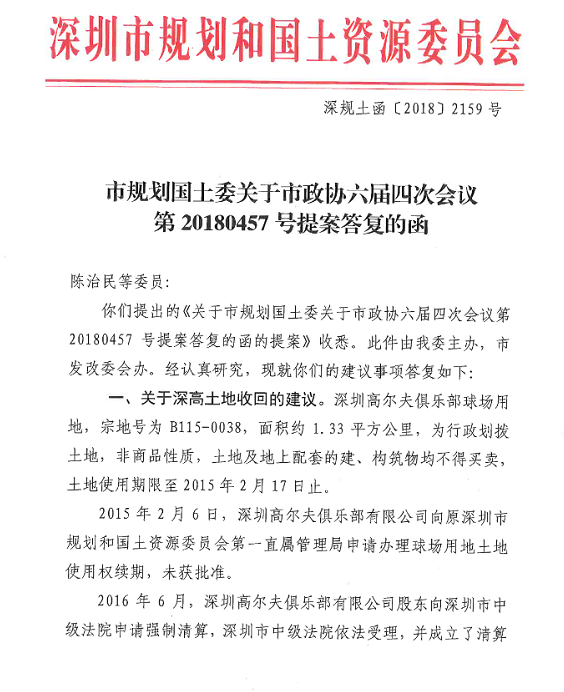 深圳新聞網(wǎng)記者注意到,2018年6月21日規(guī)土委給陳治民等政協(xié)委員的回復函中,將深圳高爾夫俱樂部球場用地到期后發(fā)生的事情,一一列了出來: