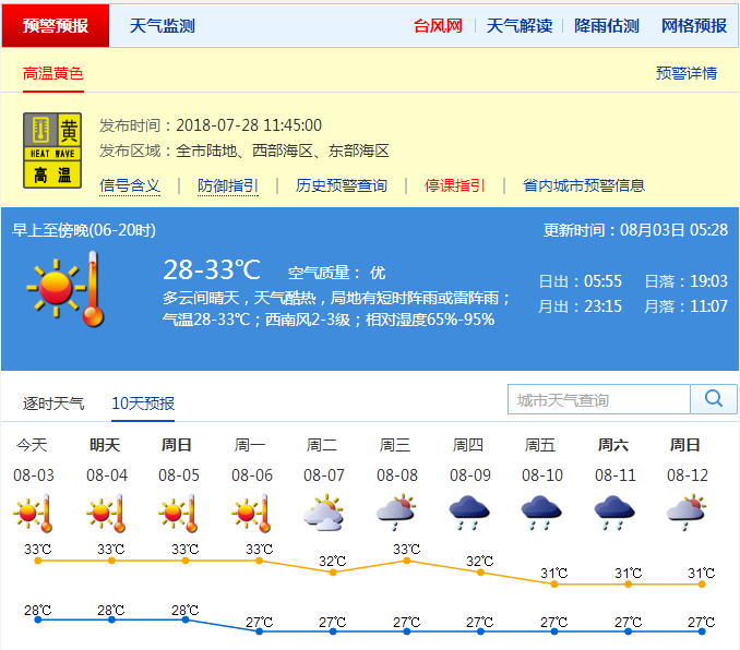 近期天氣方面,預(yù)計(jì)3日多云間晴天,天氣酷熱,局地有短時(shí)陣雨或雷陣雨,氣溫27-33℃,北部和人口密集區(qū)局地最高氣溫可達(dá)35℃;4-7日多云,局部有短時(shí)(雷)陣雨。請注意持續(xù)高溫下的防暑降溫和戶外活動、戶外作業(yè)的安全;關(guān)注局地雷雨的影響,發(fā)布雷電預(yù)警時(shí),需遠(yuǎn)離高山、開闊的地方以及樹下、較淺的山溝或者山洞、水面等地區(qū)。
