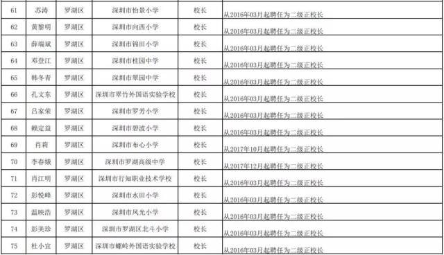 此次公示名單中,職級最高的是二級正校長,特級和一級正校長空缺。此次公示的二級正校長共157人,其中市直屬10人。各區(qū)中,二級正校長最多的是福田區(qū),共有32人,龍崗和寶安緊隨其后,分別有29、27人。羅湖、南山、龍華三區(qū),則分別有19、16和13人。其他各區(qū)的二級正校長均在10人以內(nèi)(大鵬新區(qū)暫無)。