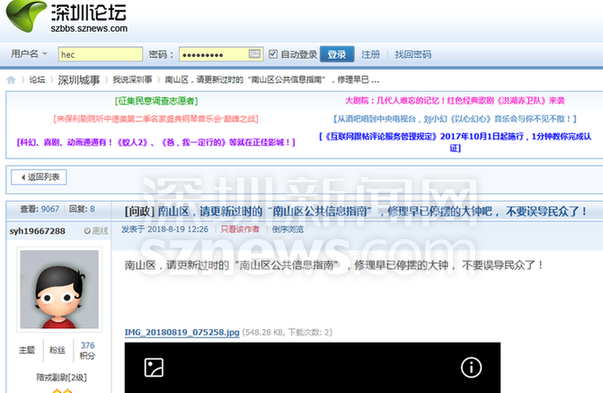 深圳新聞網(wǎng)8月24日訊(記者 何暢)近日,網(wǎng)友“syh19667288”在深圳論壇發(fā)帖《南山區(qū),請更新過時的“南山區(qū)公共信息指南”,修理早已停擺的大鐘吧, 不要誤導民眾了!》。據(jù)曝料,南山區(qū)“公共信息導向指南”指示牌中的地鐵路線信息嚴重滯后,亟需更新。