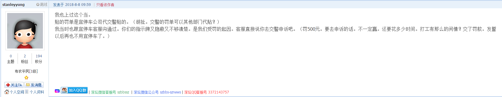 深圳新聞網(wǎng)8月29日訊(記者 施冰冰)“深圳的國(guó)資泊車位,對(duì)外地人來說是個(gè)坑?!本W(wǎng)友wzmaodong在論壇上發(fā)帖吐槽深圳宜停車。該帖文主要描述了作者因?qū)ι钲诓窜囈?guī)則了解不清,繼而被交警貼罰單的全過程,這讓出差在外的他感到“很冤”。同時(shí)也有幾位網(wǎng)友跟帖表示自己也交過這500元的“學(xué)費(fèi)”。(《深圳的國(guó)資泊車位,對(duì)外地人來說就是個(gè)坑。在不知道深圳泊車規(guī)則的情況下,輕易的被交警貼罰單。》)