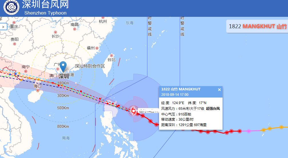 預(yù)計(jì)“山竹”將于14日夜間橫穿菲律賓呂宋島北部山地,15日上午進(jìn)入南海東北部海面,強(qiáng)度減弱,趨向粵西和海南東部沿海,16日夜間在上述地區(qū)以強(qiáng)臺(tái)風(fēng)或超強(qiáng)臺(tái)風(fēng)登陸,16日中午前后距我市最近200-300公里。不排除在陽江至茂名之間登陸、對(duì)深圳造成更大風(fēng)雨影響的可能。