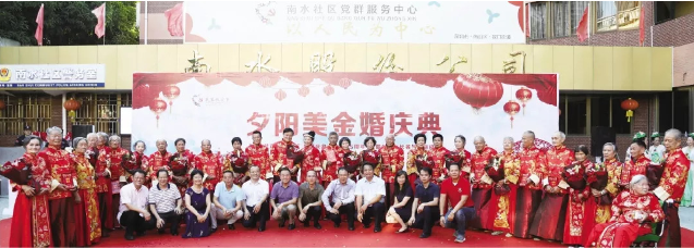 蛇口街道南水社區(qū)居民耿玉璽與王月鳳兩位老人已經(jīng)攜手走過(guò)69年,一直有個(gè)遺憾藏在心里——兩人年輕時(shí)沒(méi)有舉辦過(guò)婚禮,連一張結(jié)婚照片都沒(méi)有。日前,二老的遺憾得到彌補(bǔ),愿望得以實(shí)現(xiàn)。南水社區(qū)黨委以開(kāi)展民生微實(shí)事為契機(jī),為包括耿玉璽與王月鳳夫婦在內(nèi)的社區(qū)15對(duì)老年夫婦舉辦了一場(chǎng)別開(kāi)生面的夕陽(yáng)美集體金婚慶典活動(dòng)。眾多嘉賓及老人的親朋好友、子女兒孫到場(chǎng)見(jiàn)證,獻(xiàn)上掌聲和祝福。