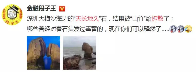 “天長地久”石被吹倒的畫面,在2008年,強(qiáng)臺風(fēng)“黑格比”來襲時(shí),同樣出現(xiàn)過,只不過當(dāng)時(shí)的“天長地久”石,被吹倒的是右邊的石頭。