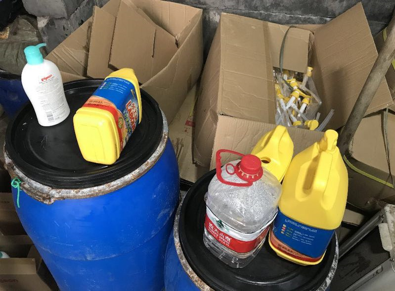 經(jīng)過執(zhí)法人員檢查,發(fā)現(xiàn)現(xiàn)場有疑似用來制作洗潔精、消毒液等的原料和工具,現(xiàn)場一些箱子中還有未灌裝的空罐子以及一些待貼標(biāo)簽。據(jù)了解,當(dāng)事人從外面以低廉價格買來比較劣質(zhì)、不知名的原料,通過簡單勾兌,再分裝成知名品牌日化用品。