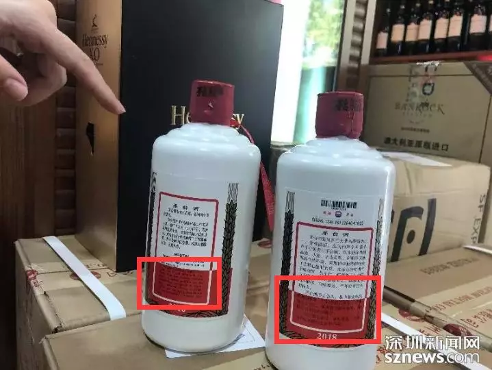 左邊為出口版茅臺,有中英文標簽,執(zhí)法人員稱不允許在國內(nèi)流通,或涉嫌走私;右邊的只有中文標簽的,為允許在國內(nèi)流通的茅臺酒。市民朋友們購買茅臺時需留意。