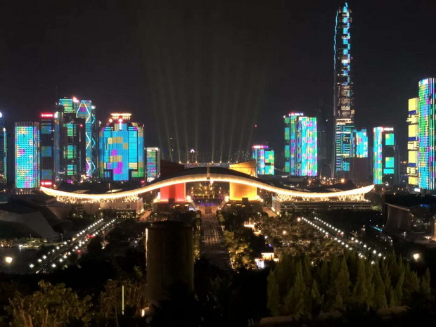 這臺別開生面的晚會,主舞臺設(shè)在市民中心廣場,舞臺后方呈現(xiàn)著深圳市精心打造的福田中心區(qū)43座樓宇燈光秀,五彩斑斕、綺麗多姿的深圳城市新夜景,與晚會現(xiàn)場舞臺融為一體,為市民和廣大觀眾呈現(xiàn)出一個迷人的“深圳之夜”。