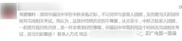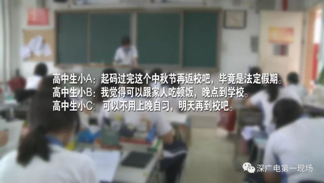 今天,深圳市高級(jí)中學(xué)、深圳市福田中學(xué)、沙井中學(xué)、東方英文書(shū)院的一些高中學(xué)生,通過(guò)在線(xiàn)留言等多種方式,向欄目反映,中秋節(jié)是法定假日,但他們卻沒(méi)法和家人一起吃飯團(tuán)聚,更別提賞月看晚會(huì)了,原因是學(xué)校要求寄宿的學(xué)生今天晚上要提早返校,參加晚自習(xí)或者考試。