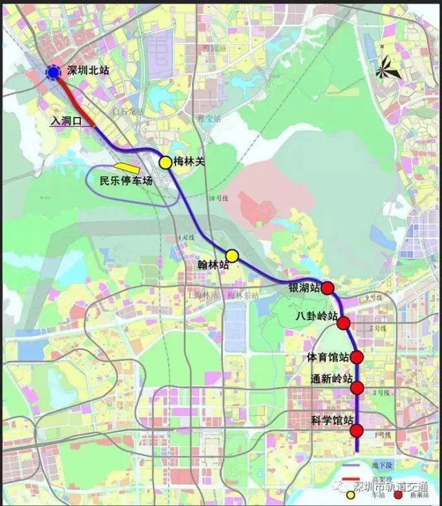 6號(hào)線二期工程線路全長(zhǎng)約11.8Km,包括7站7區(qū)間、其中換乘車站4座,從深圳北站預(yù)留高架橋工程引出,途徑龍華、福田、羅湖三區(qū)。
