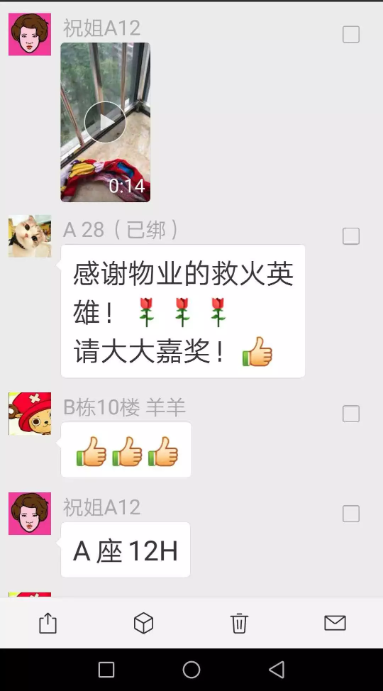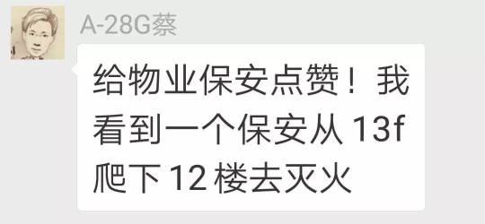 ▲業(yè)主在微信群紛紛點贊物業(yè)救火英雄。