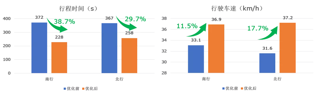 錦程路全長(zhǎng)約4.4km,為進(jìn)一步提升路段行車舒適性,9月5日,深圳交警重新優(yōu)化錦程路(萬安-沙福)協(xié)調(diào)子區(qū),優(yōu)化后南往北平均行程時(shí)間由367s降至258s,降幅29.7%,平均行駛速度由31.6km/h提升到37.2km/h,提升17.7%;北往南平均行程時(shí)間由372s降至228s,降幅38.7%,平均行駛速度由33.1km/h提升到36.9km/h,提升11.5%。