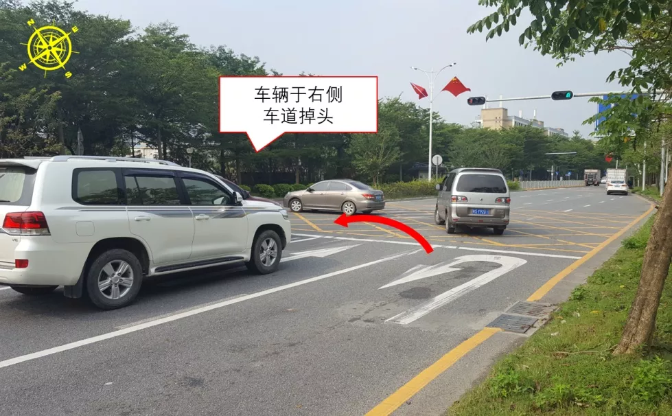 福鳳/騰豐三路口東側(cè)為鳳凰山旅游區(qū),通勤車流較多?,F(xiàn)狀路口未設(shè)置紅綠燈,人車交織嚴(yán)重,交通秩序混亂,易發(fā)交通事故。9月14日,深圳交警啟用福鳳/騰豐三路口信號燈。為解決掉頭車轉(zhuǎn)彎半徑不足問題,進(jìn)一步在距路口約96米處開設(shè)掉頭口,并以最外側(cè)車道作為掉頭車道,同時(shí)與福鳳/騰豐三路口實(shí)施聯(lián)動(dòng)設(shè)置燈控掉頭。該路口是寶安首個(gè)“一機(jī)兩控”+外側(cè)掉頭微創(chuàng)新路口。