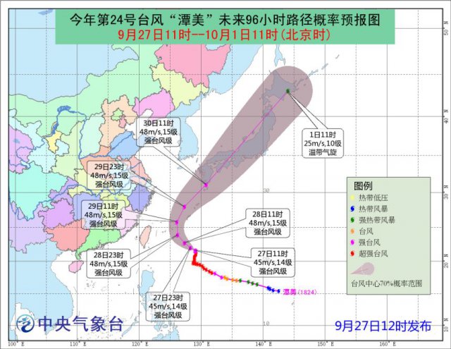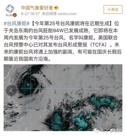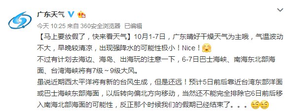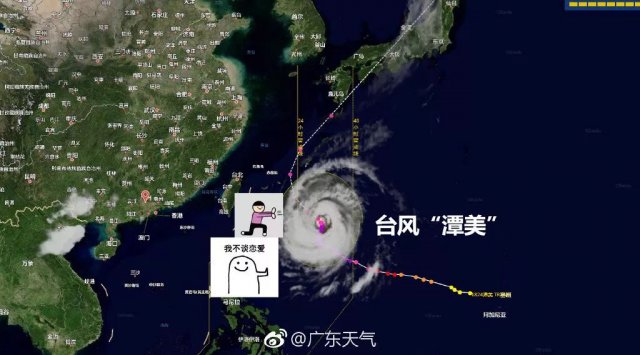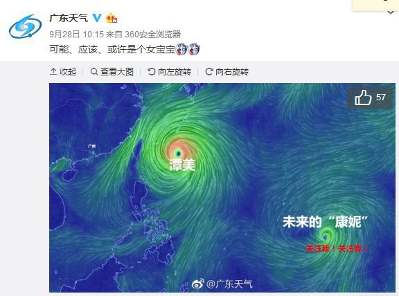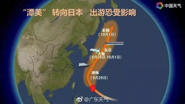 另據(jù) @廣州天氣,"潭美"28-29日最接近臺灣,隨后掉頭往東北方向移動,國慶期間前往臺灣的朋友不用擔心。