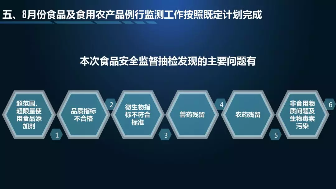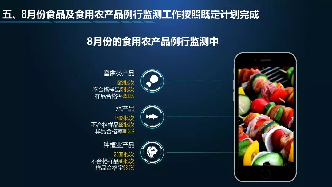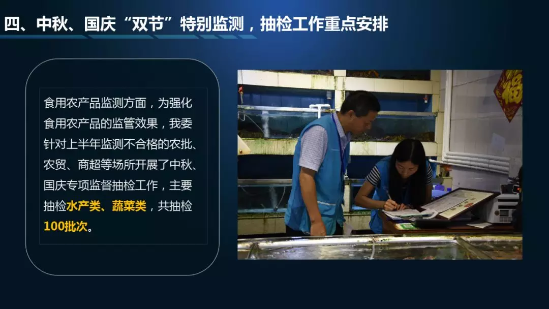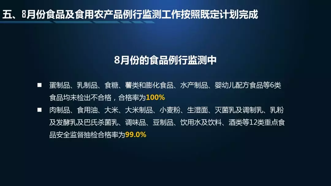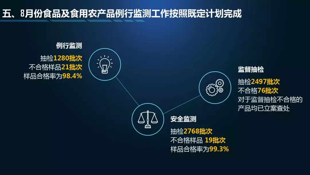 第二個(gè)“3”是三項(xiàng)檢測(cè)結(jié)果通報(bào),分別是中秋、國(guó)慶的特別監(jiān)測(cè)通報(bào),8月份食品例行監(jiān)測(cè)通報(bào),8月份食用農(nóng)產(chǎn)品例行監(jiān)測(cè)通報(bào);