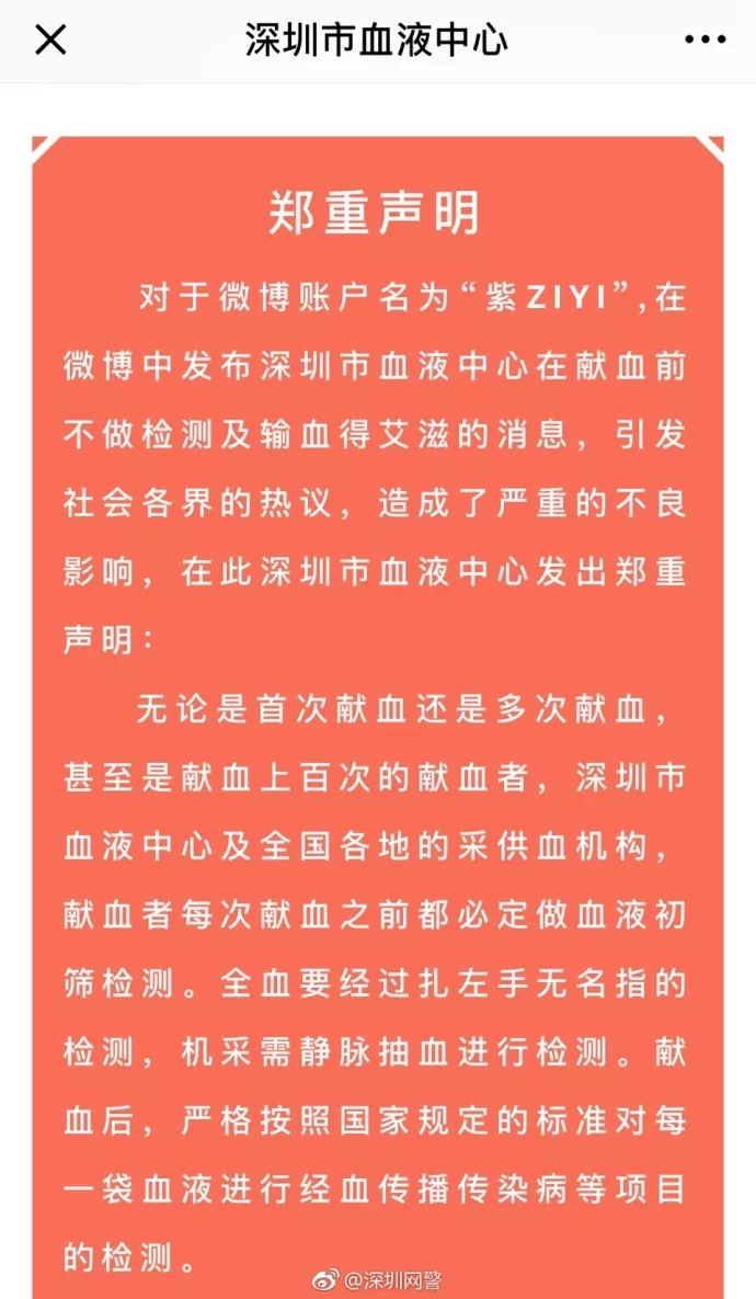 日前,微博名為“紫ZIYI”網(wǎng)友聲稱其在深圳獻(xiàn)血未做血液檢查。