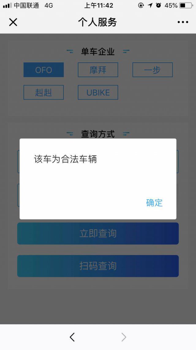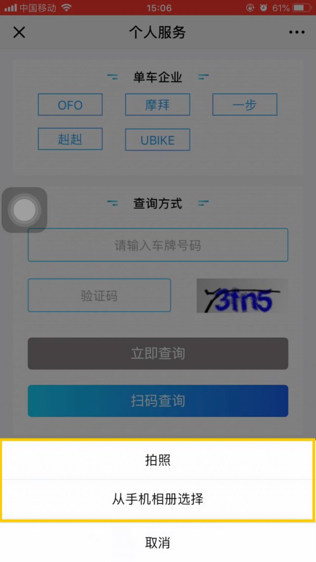 提交完手機號和驗證碼之后,我們就來到了這個頁面,在這里,你可以選擇你要查詢的共享單車的品牌,品牌選擇完畢后,你可以選擇手動輸入車牌號碼或掃碼查詢!