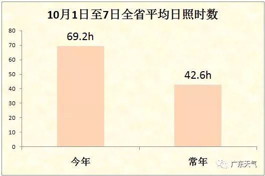 10月1日到7日,全省平均日照時數(shù):今年69.2h,常年42.6h,1951年以來排名第一。