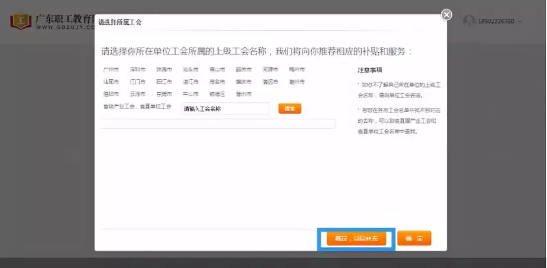 1.進(jìn)入個(gè)人中心頁(yè)面,系統(tǒng)自動(dòng)彈出工會(huì)所屬窗口,選擇所屬工會(huì),如仍未確定所屬工會(huì),可點(diǎn)擊【跳過(guò),以后補(bǔ)充】;如已確定所屬工會(huì),請(qǐng)選擇所屬工會(huì),點(diǎn)擊【確定】;
