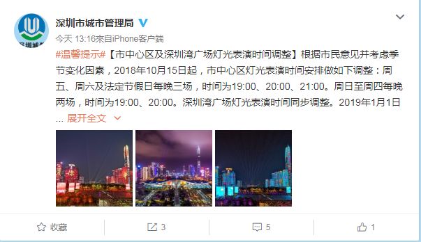 近期,深圳燈光秀表演刷屏朋友圈。今天(10月14日)13時(shí),深圳市城市管理局發(fā)布通知稱,根據(jù)市民意見并考慮季節(jié)變化因素,10月15日起,深圳市中心區(qū)及深圳灣廣場燈光表演時(shí)間調(diào)整。