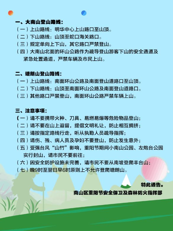 為確保重陽節(jié)期間登山安全,定于2018年10月16日至18日中午12時(shí)為登山重點(diǎn)防護(hù)期,請(qǐng)市民自覺遵守有關(guān)規(guī)定。