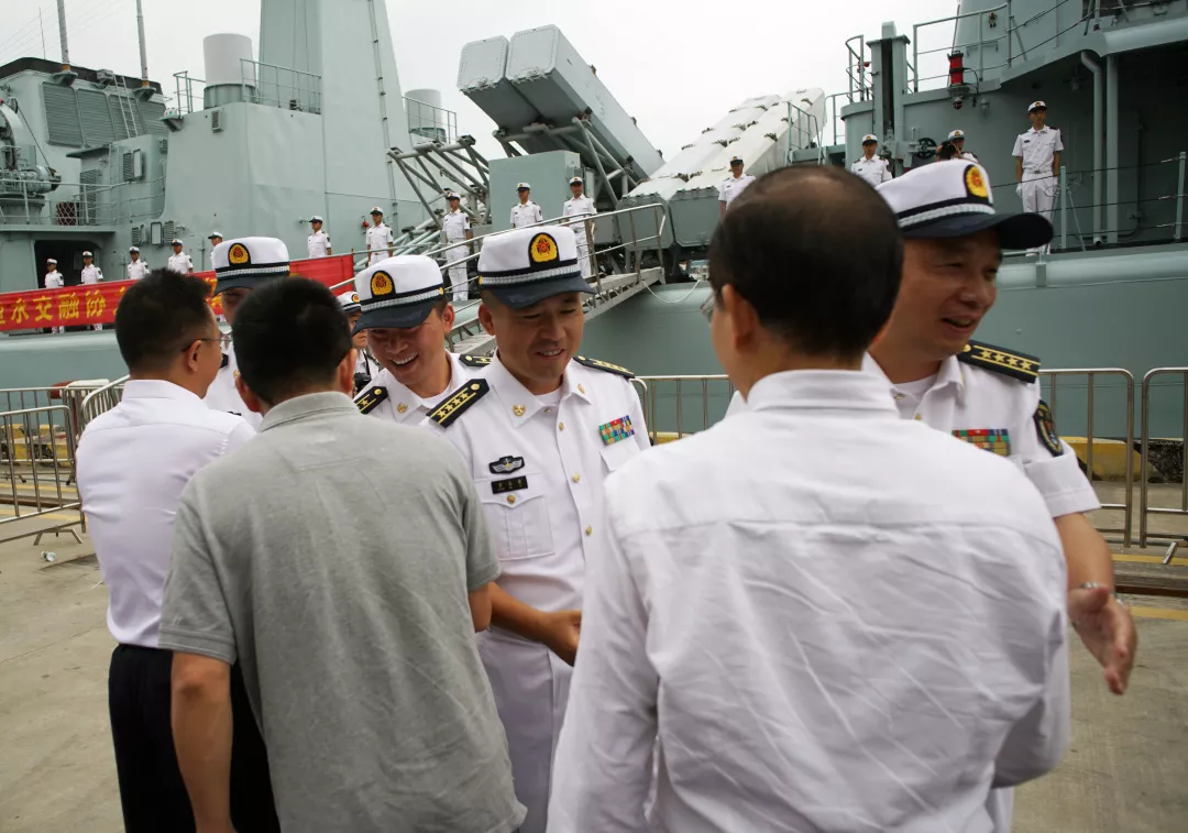 深圳市委副秘書長(zhǎng)劉平生,市民政局局長(zhǎng)廖遠(yuǎn)飛,南山區(qū)委常委、宣傳部部長(zhǎng)廖子彬,南山區(qū)委常委、人武部部長(zhǎng)彭耀玖,副區(qū)長(zhǎng)謝炳文等領(lǐng)導(dǎo)代表市、區(qū)雙擁辦在碼頭上歡送深圳艦。南部戰(zhàn)區(qū)海軍副參謀長(zhǎng)李曉巖少將,深圳艦所在某驅(qū)逐艦支隊(duì)副政委蔣軍大校,深圳艦艦長(zhǎng)黃北奇大校,深圳艦政委陳永強(qiáng)上校等與深圳親人一一握手道別。