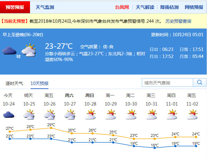 今日,鵬城以多云天氣為主,仍有分散小雨。早晚天氣較涼,最低氣溫在23℃左右,白天最高氣溫升至27℃左右。風(fēng)力和緩,市區(qū)內(nèi)維持2-3級(jí)的平均風(fēng)力,沿海地區(qū)平均風(fēng)力3-4級(jí),最大陣風(fēng)達(dá)到6級(jí)。相對(duì)濕度適中,最小相對(duì)濕度為60%,最大濕度90%。