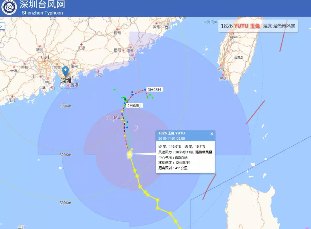 11月1日上午08時臺風“玉兔”位于距離深圳411公里的南海海面上,其中心附近最大風力11級(30米/秒),預計臺風“玉兔”將以12km/h的速度緩慢北行,2日強度明顯減弱。