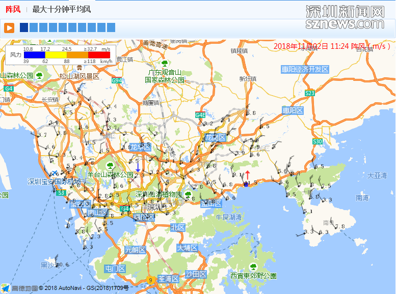 市氣象臺于11月2日11時24分發(fā)布最大十分鐘平均風(fēng)值