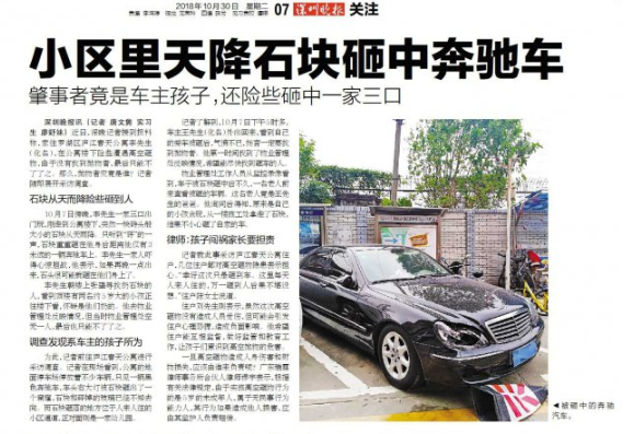 沒想到,最后得知原來是自己的小孩貪玩,從一樓施工處拿走了石塊,結(jié)果不小心砸了自家的車。