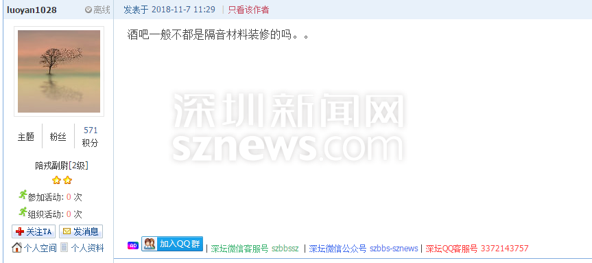 深圳新聞網(wǎng)11月7日訊(記者 施冰冰)11月6日,有網(wǎng)友在論壇爆料稱民治藍(lán)坤大廈米蘭國(guó)際酒吧每晚營(yíng)業(yè)至凌晨4點(diǎn),音樂(lè)聲震耳欲聾,嚴(yán)重影響了附近居民的睡眠,“逼得”該網(wǎng)友只能搬家。(網(wǎng)帖地址:https://szbbs.sznews.com/thread-3815241-1-1.html)