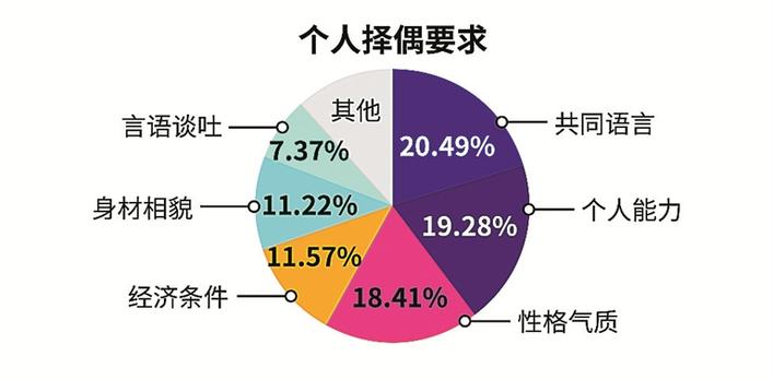 調查顯示,共同語言、個人能力、性格氣質為單身男女在擇偶時最看重的三個方面,其次為經濟條件、身材相貌、言語談吐??梢?,相較于過去條件上的匹配,更重視精神上的契合。