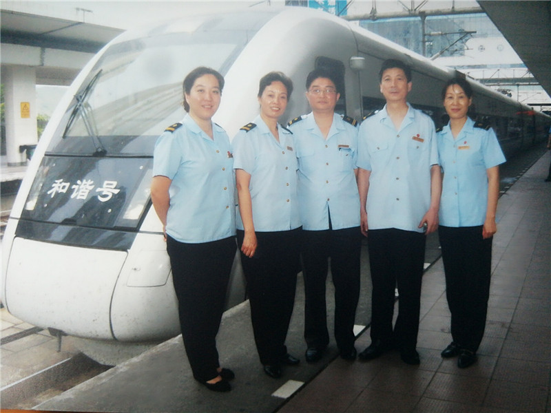 深圳火車站開行第一趟和諧號,葉迎春(右一)和同事在列車前合影