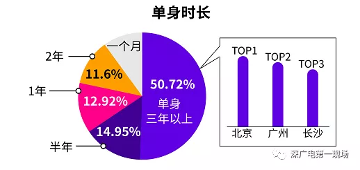 針對單身時(shí)長的調(diào)查發(fā)現(xiàn),有高達(dá)50.72%的人為單身三年以上的“長單族”,“長單族”占比最多的城市前三為北京、廣州和長沙。