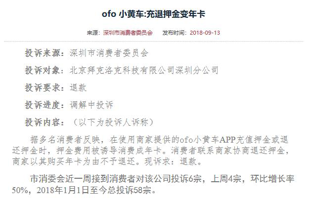 根據(jù)深圳市消費者委員會官網(wǎng)公布的消息,今年針對ofo的投訴增長迅速。1月1日至9月13日,投訴數(shù)量為58宗。截至11月14日,僅2個月時間,投訴增加180起,總數(shù)達238宗。
