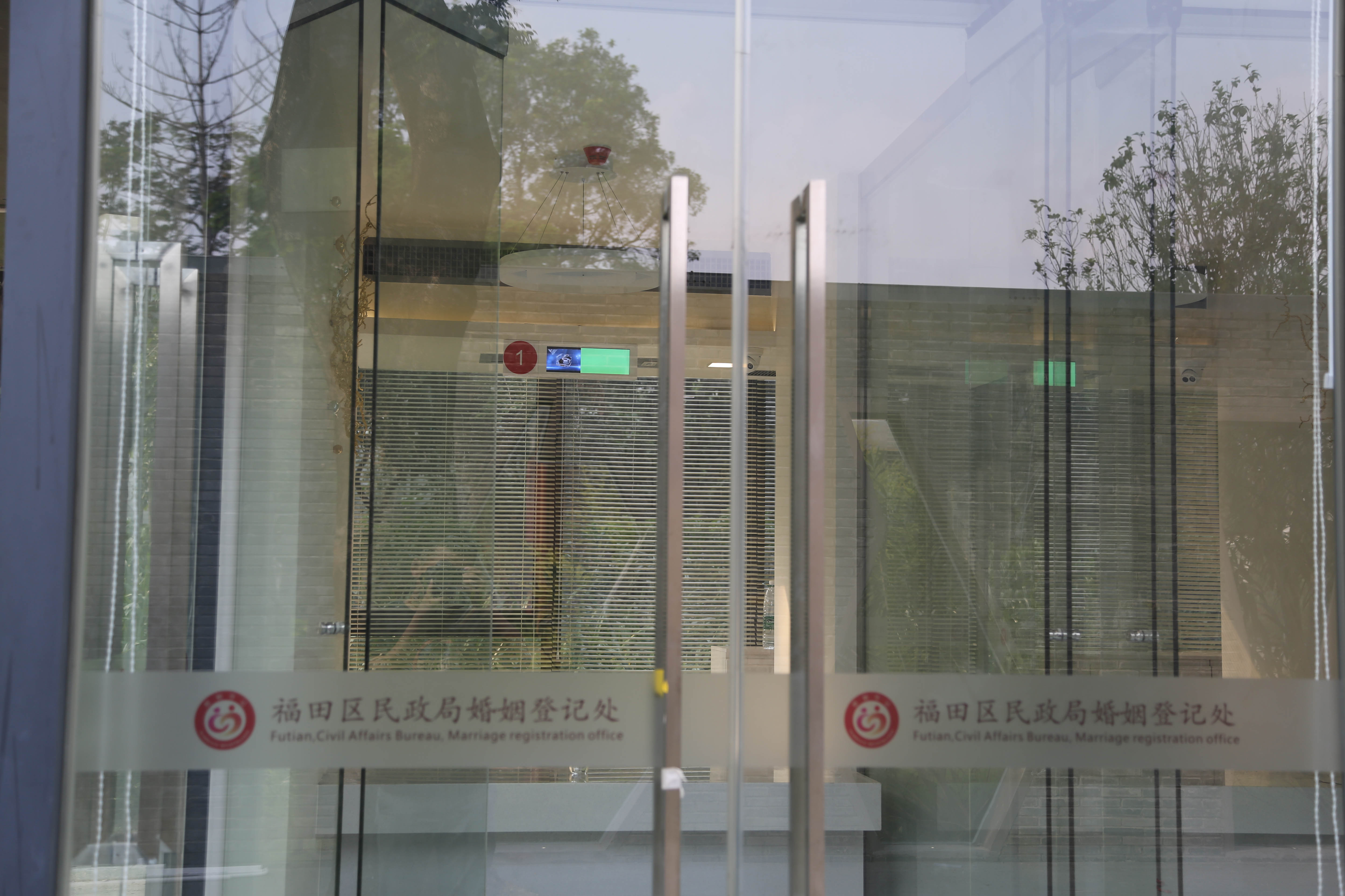 站在中式禮堂看對(duì)岸的福田區(qū)民政局婚姻登記中心叫號(hào)大廳。