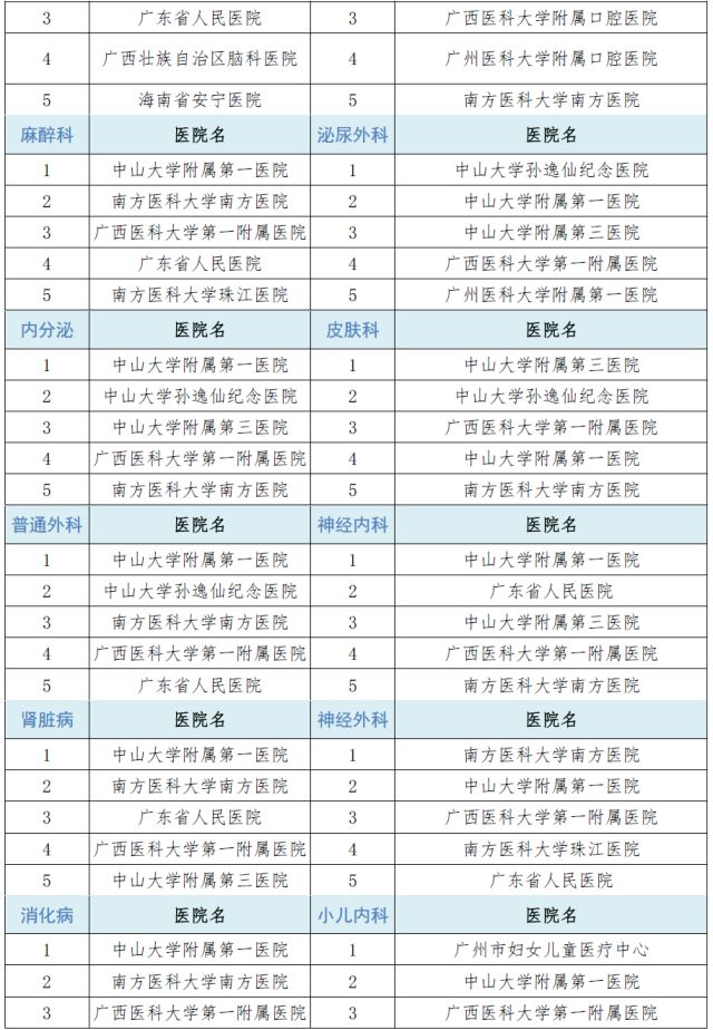 此外,廣東進(jìn)入全國(guó)??魄笆钠渌麑?朴?中山三院的風(fēng)濕科;廣州市精神衛(wèi)生中心(廣州惠愛醫(yī)院)的精神醫(yī)學(xué);中山大學(xué)光華口腔醫(yī)院的口腔科;中山大學(xué)孫逸仙紀(jì)念醫(yī)院的泌尿外科、內(nèi)分泌科;廣州市婦兒中心的小兒外科;廣州醫(yī)科大學(xué)附屬第一醫(yī)院的胸外科;中山大學(xué)附屬腫瘤醫(yī)院的胸外科與腫瘤學(xué)。