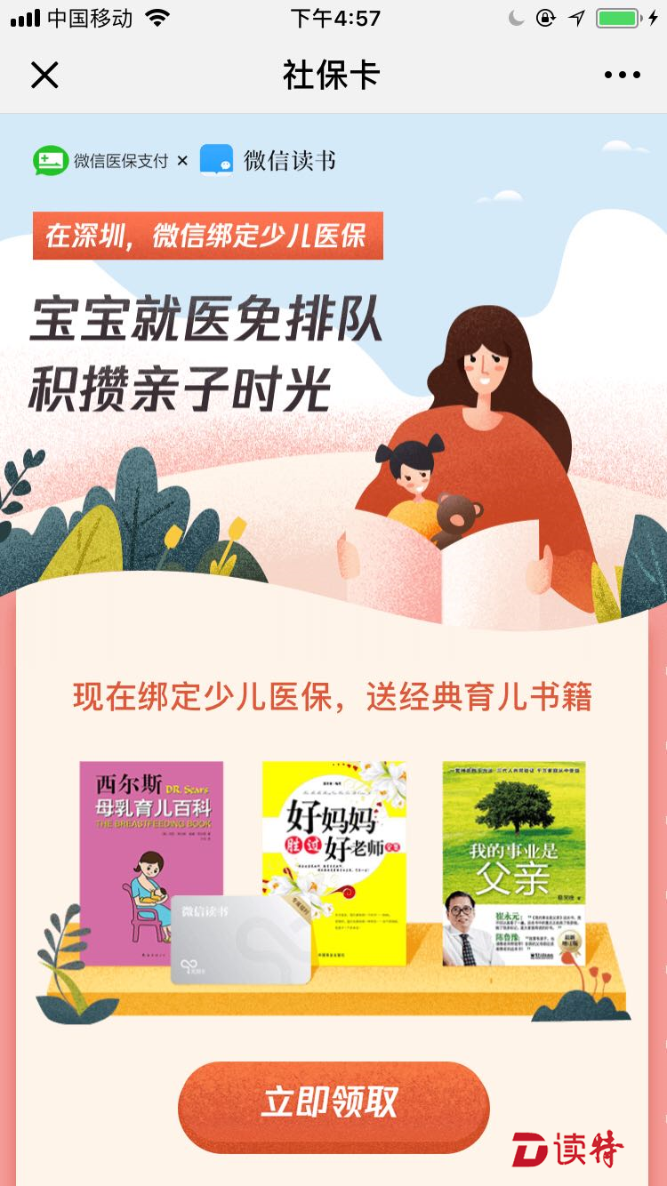 深圳特區(qū)報2018年11月21日訊 作為微信醫(yī)保支付的試點城市,深圳又開通便民新服務(wù),全國內(nèi)率先開通微信綁定少兒社??ǎС稚賰横t(yī)保線上支付服務(wù)。記者獲悉,11月20日起,父母在微信綁定孩子的少兒社???,就可以用微信上通過醫(yī)保給孩子繳納掛號、就診費用,省去排隊煩惱。此外,20日起,用戶在微信綁定少兒社??ǎ擅赓M領(lǐng)取微信讀書三本經(jīng)典育兒書籍和3天無限閱讀卡兌換碼。