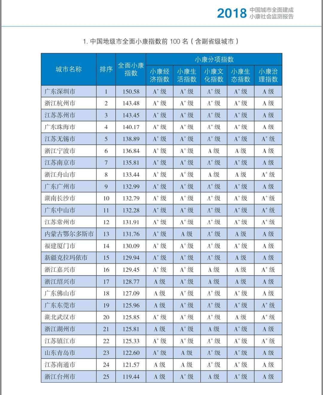 其中,深圳全面小康指數(shù)達(dá)150.58分,位列全國地級市(含副省級城市)全面小康指數(shù)前100名榜首。在分項(xiàng)指標(biāo)中,深圳的小康經(jīng)濟(jì)指數(shù)、小康生活指數(shù)、小康文化指數(shù)、小康生態(tài)指數(shù)均達(dá)到A+級,小康治理指數(shù)為A級。