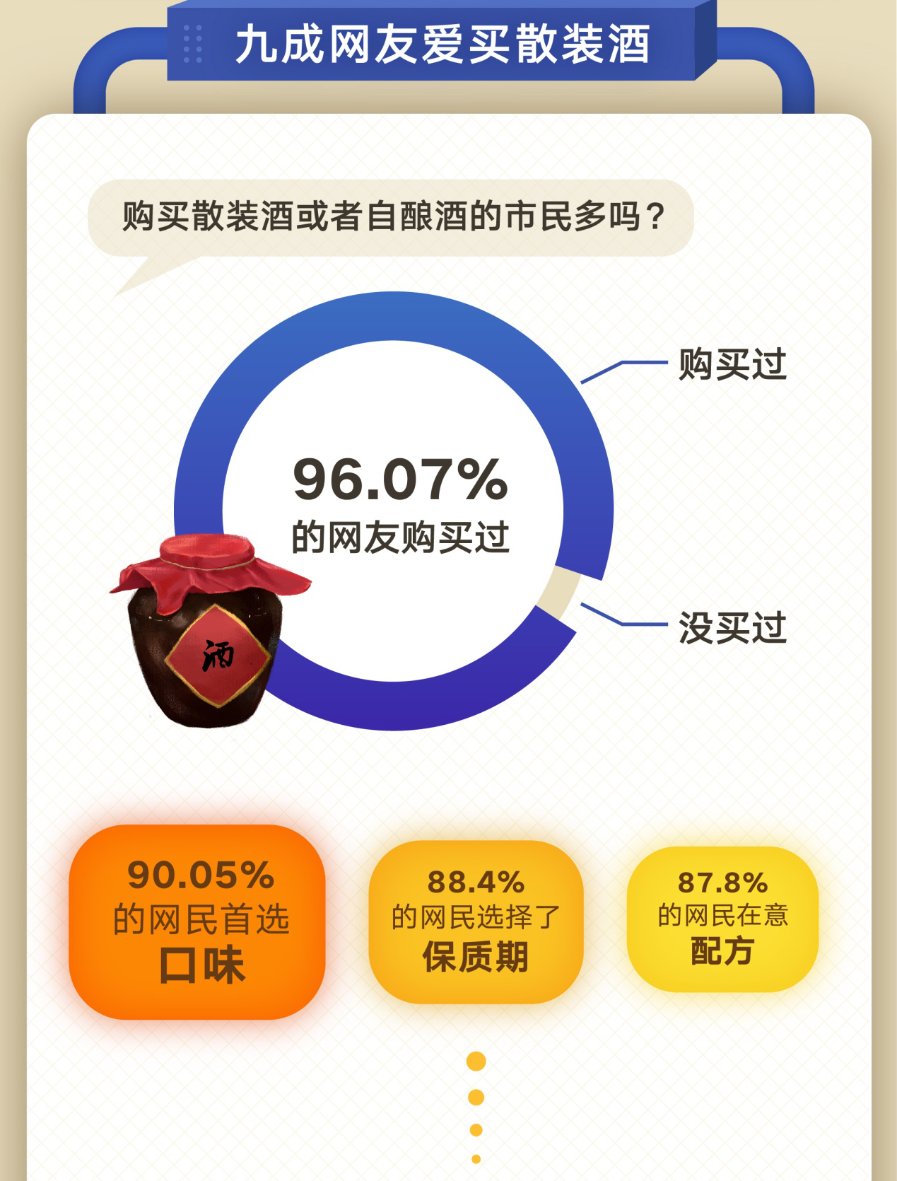 在深圳,購買散裝酒或者自釀酒的市民多嗎?根據(jù)此次調(diào)查數(shù)據(jù)顯示,高達96.07%的網(wǎng)友都曾購買過,可見散裝酒和自釀酒的受歡迎程度。 買散裝酒最看重什么?調(diào)查數(shù)據(jù)顯示,90.05%的網(wǎng)民首選口味;88.4%的網(wǎng)民選擇了保質(zhì)期;87.8%的網(wǎng)民在意配方,而對安全性關注的只有7.95%。