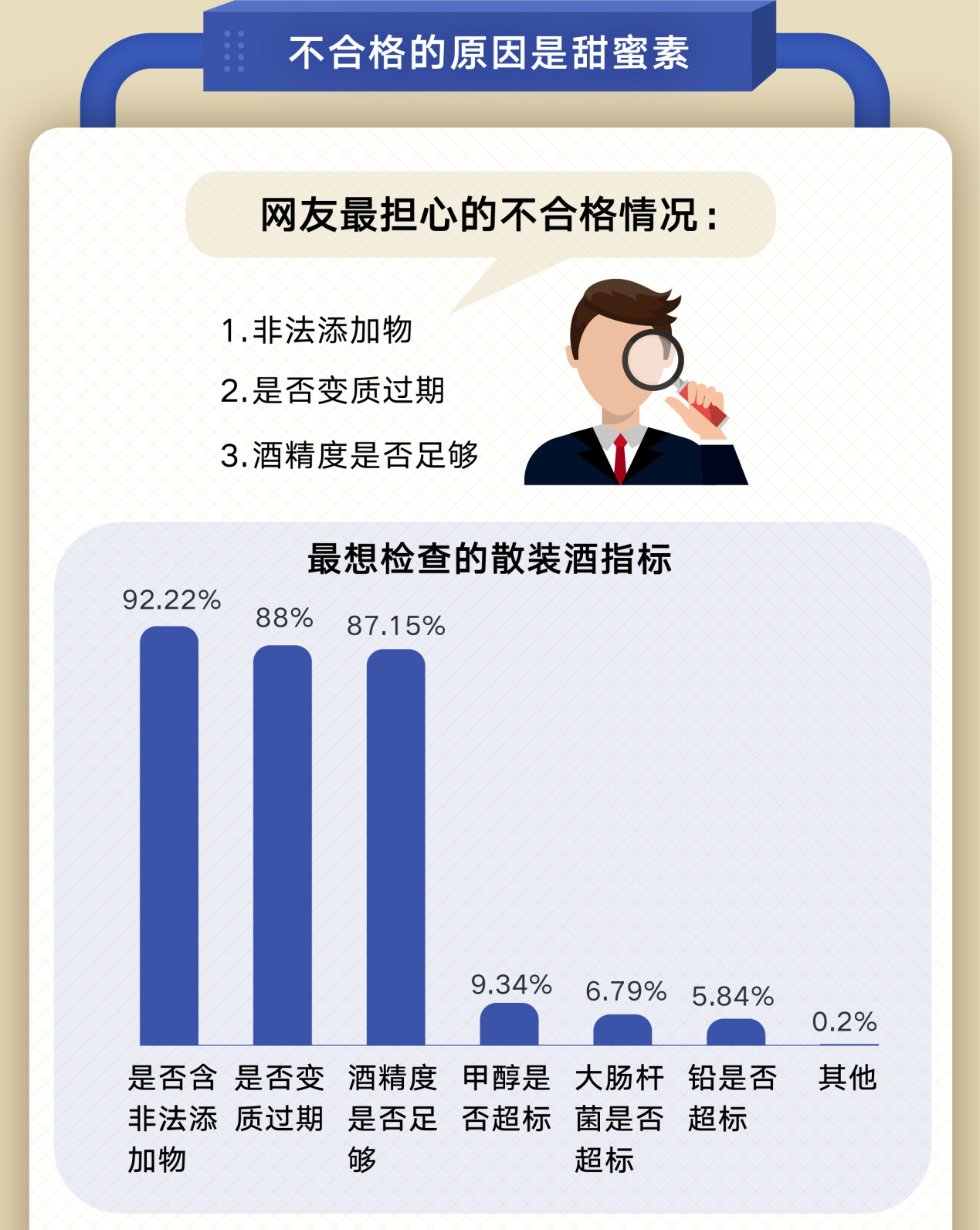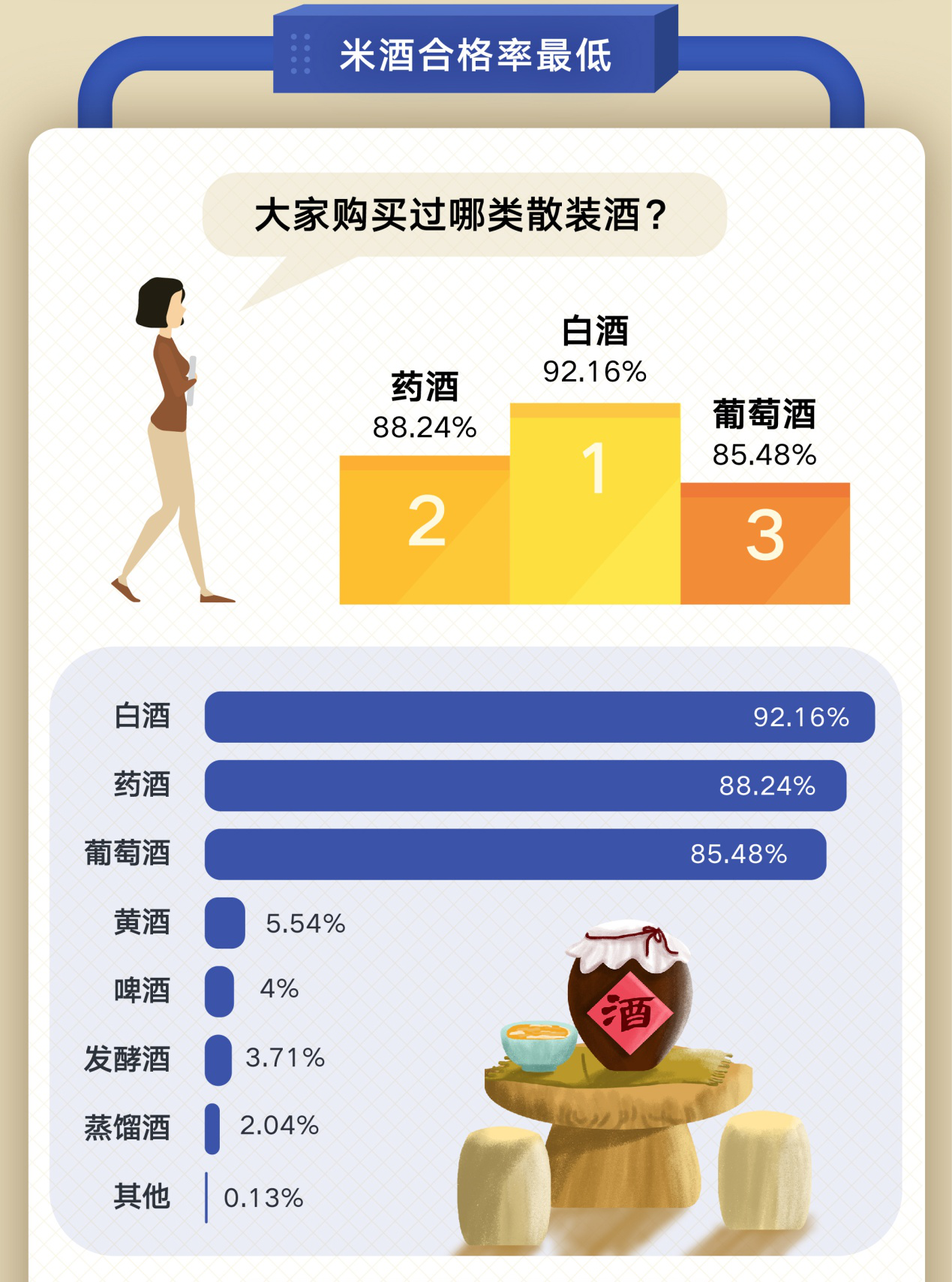 根據(jù)投票結(jié)果,此次共抽檢各類散裝酒143批次,11批次不合格,合格率92.3%。其中,抽檢白酒23批次,合格率100%;抽檢高粱酒60批次,5批次不合格,合格率91.67%;抽檢米酒51批次,不合格6批次,合格率88.2%。