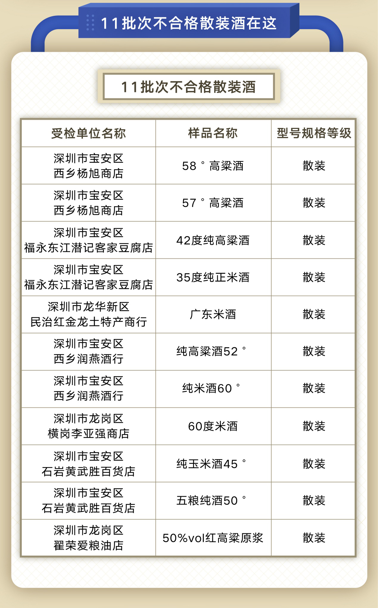 根據(jù)調(diào)查結(jié)果,此次共抽檢商行、酒行、煙酒店散裝酒水46批次,3批次不合格,合格率93.5%;抽檢商店、便利店、百貨店散裝酒29批次,5批次不合格,合格率82.8%。其他抽檢的散裝酒場所還有糧油店、豆腐店、土特產(chǎn)商店等。
