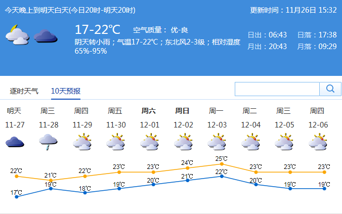 市氣象局發(fā)布未來(lái)十天天氣預(yù)報(bào)(數(shù)據(jù)更新于11月26日15時(shí)32分)
