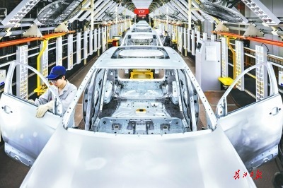 如今,武漢GDP超萬億。圖為工人們?cè)谄嚿a(chǎn)流水線上工作長(zhǎng)江日?qǐng)?bào)記者周超 攝