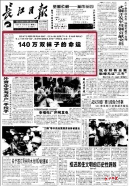 《140萬雙襪子的命運(yùn)》于1997年7月30日首發(fā)于長(zhǎng)江日?qǐng)?bào)一版,獨(dú)家報(bào)道了武漢襪廠倉庫里積存了兩火車皮襪子,其中最長(zhǎng)的沉睡了10年,但是面對(duì)眾多商家訂單,工廠卻長(zhǎng)年不肯“吐貨”,商家開價(jià)越來越低,襪子在一天天貶值。此報(bào)道一出,轟動(dòng)全國,多家媒體轉(zhuǎn)載,并獲得第八屆中國新聞獎(jiǎng)一等獎(jiǎng)。
