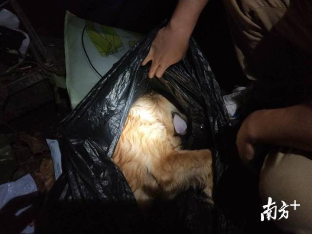 事后,愛(ài)心人士在南山市場(chǎng)附近的垃圾桶中找到了用黑色塑料袋包裹的小狗尸體,發(fā)現(xiàn)死去的寵物狗還是一只未成年的金毛幼犬。